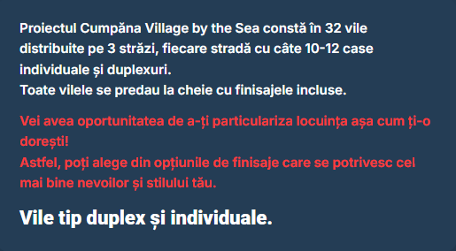 Proiectul Cumpăna Village By The Sea, amplasat la 5 minute față de Constanța, în comuna Cumpăna, propune un nou stil de viață, un concept aparte de tip gated community. Proiectul Cumpăna - Village by the Sea constă în 210 vile, 20 de străzi, fiecare strada cu câte 10-12 case individuale și duplexuri.